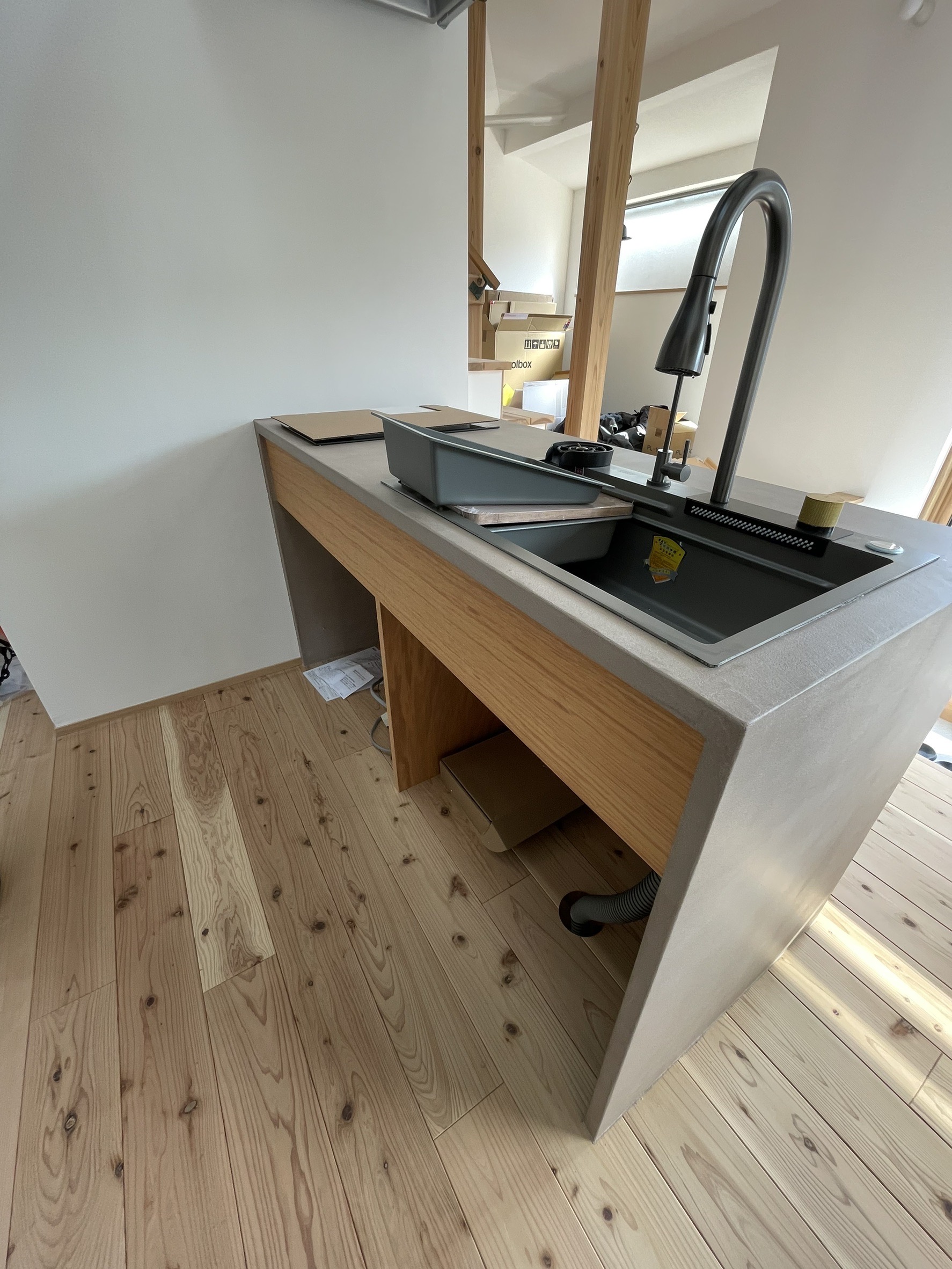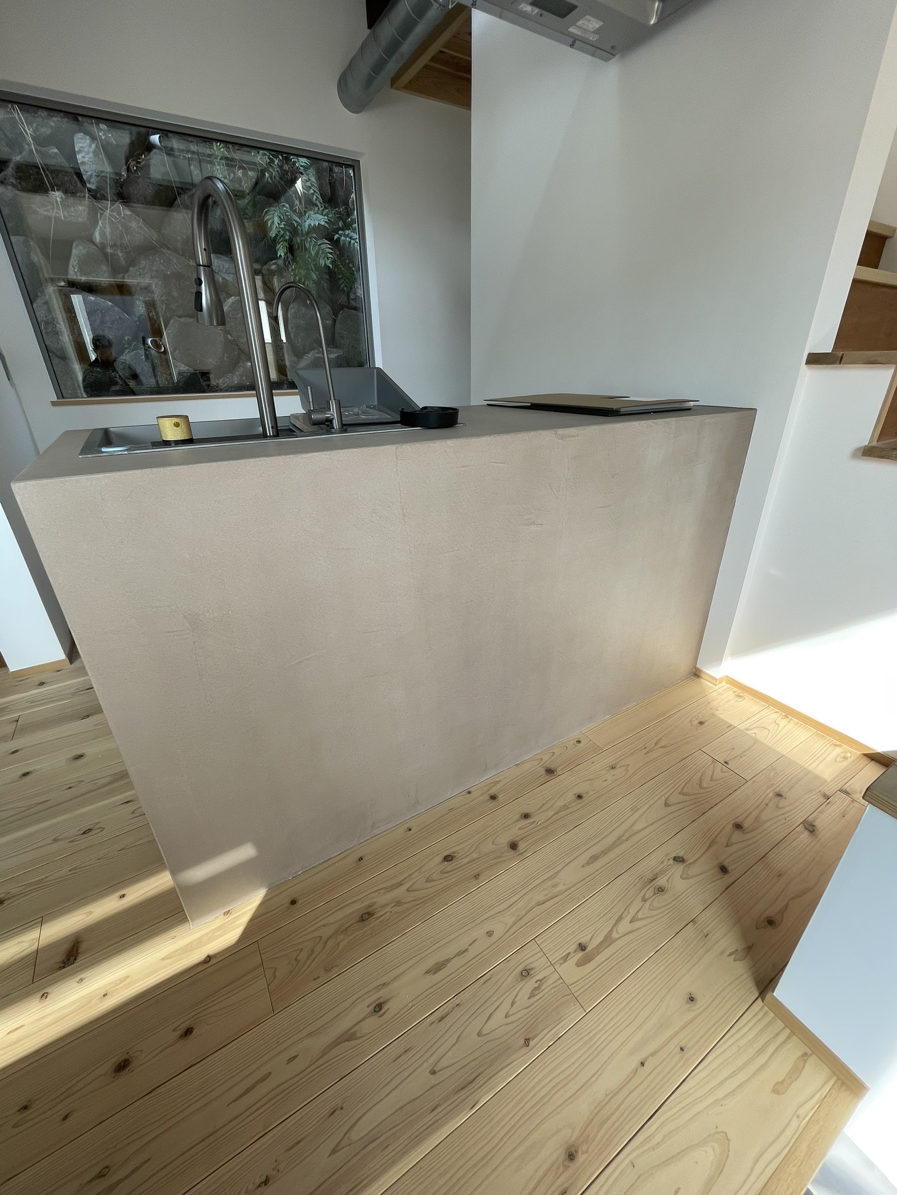 今回は新築個人宅のキッチンをモールテックスのグレージュで施工しました。 施工は社長自らしており、社長独特の柄で仕上がっています。家の作りといいアンティークな仕上がりになっております。